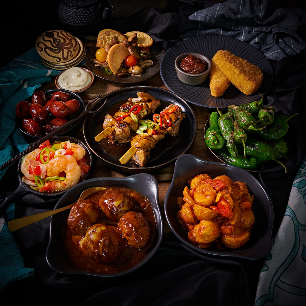 Oven roasted potatoes topped with lightly spiced bravas sauce and garlic aioli